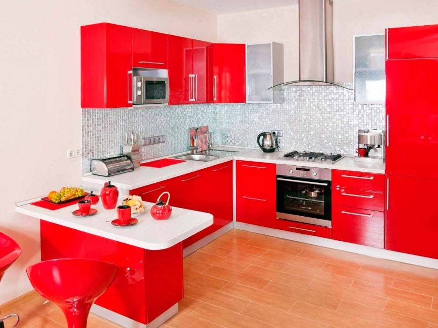 - Хай-тек. Изобилие самой инновационной бытовой техники. Мебель с глянцем сочных, контрастных цветов. Все это отличает данный стиль. Здесь можно развернуться, создав уникальный дизайн. Глянцевые фотоповерхности, стеклянные покрытия, современное оборудование просто обязательны. Максимальное количество металлических деталей, минимальное — деревянных, изобилие модного декора.