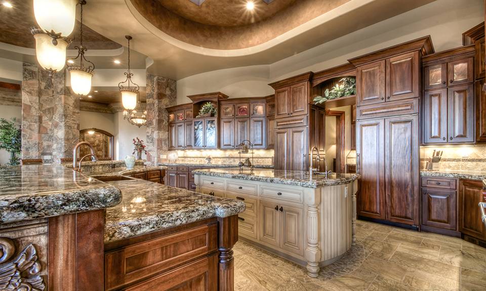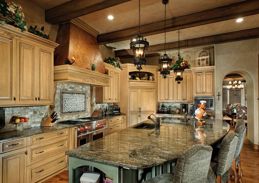 В отделке стен широко используется декоративная или так называемая венецианская штукатурка. Допускается сочетание разных фактур и материалов: плитки под старину с неровными кромками, мозаичная плитка и панно (их можно также использовать для фартука и столешницы), фрески, настенная живопись, зеркала. На потолке очень аутентично смотрятся полиуретановые фальшбалки цвета закопченного дерева или настоящие деревянные балки, создающие эффектный контраст со светлым оттенком потолка. При малой высоте помещения можно обойтись натяжным потолком с подсветкой или побелкой.