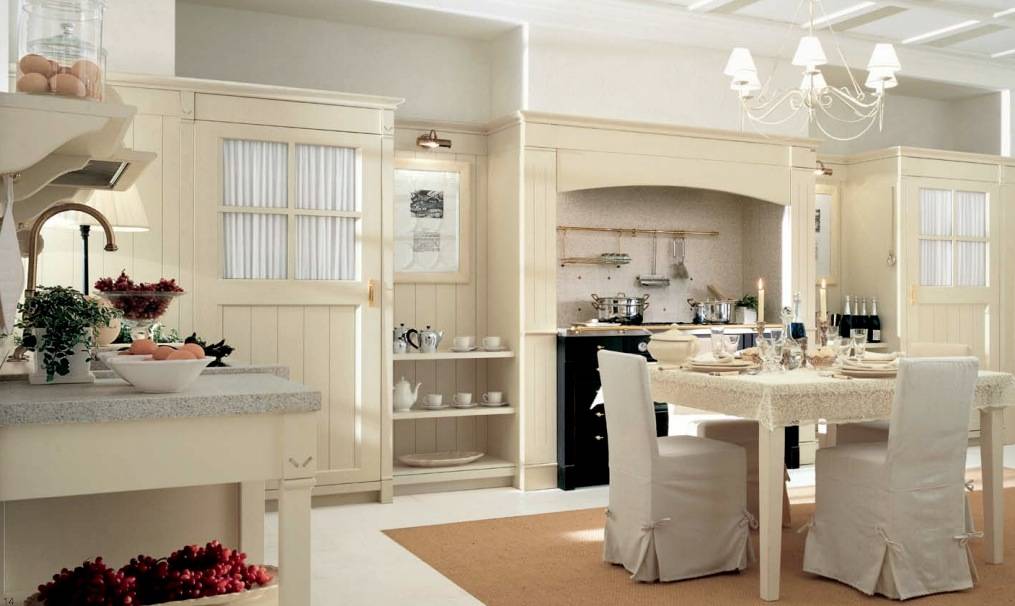 Основательность и массивность мебели. Визуально она должна рождать ощущение надежности и долговечности.Для итальянской кухонной мебели характерны элементы ковки и резьбы, роспись во флористическом стиле, изящная фурнитура. Открытые полки в некоторых шкафах, достаточное количество ящиков и полочек.