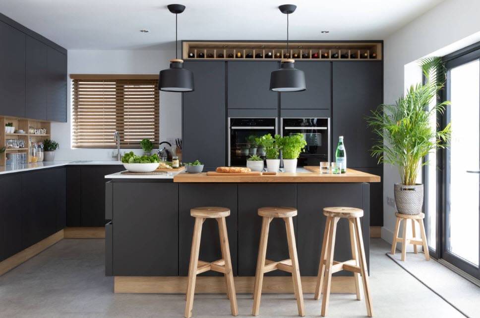 Черные кухни подойдут любителям неординарности. Монохромный интерьер – не лучший выбор, но его можно сделать акцентным. В большой кухне с достаточным освещением, его присутствие на мебели, рабочих поверхностях и декоре подчеркнут бежевые оттенки, в маленькой комнате он хорошо смотрится на одной из стен, элементах половой плитки, верхней или нижней части гарнитура.