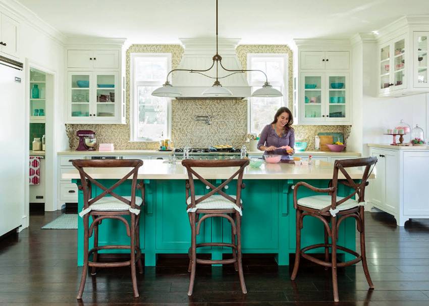 Голубой — еще один классический цвет для кантри кухни. Он натуральный, создает ощущение свежести и прохлады, успокаивает. Поэтому рекомендуем использовать светлые синие оттенки для оформления деревенской кухни не только в мебели, но и текстиле и декоре.