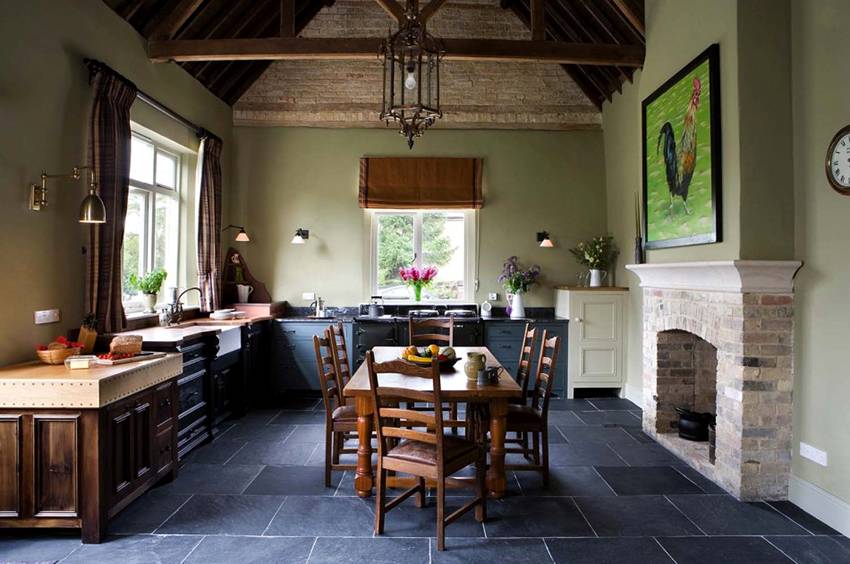 Здесь единственное требование – все цвета должны быть природными. В отличие от города, деревенские дома часто имели совмещенную кухню со столовой. Делалось это от бедности, в центре сруба ставилась большой деревенская печь, по периметру размещались помещения