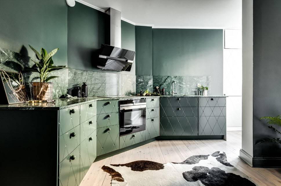 Зеленая кухня наполнена энергетикой теплого радостного лета. Приглушенные тона ассоциируются со спокойствием и умиротворением. Разные сочетания салатовых оттенков создают неповторимые визуальные эффекты и круглый год радуют глаз своей сочной зеленью. Яркие тона используют на маленьких элементах декора, а глубокие синеватые оттенки раскрываются на больших площадях. Это правило не всегда относится к небольшим кухням. Для них лучше использовать только преобладание светлых тонов. Для помещения с окнами, выходящими на юг, характерны холодные приглушенные цвета, а с расположенными на север, наоборот, теплые, с желтоватыми переливами.