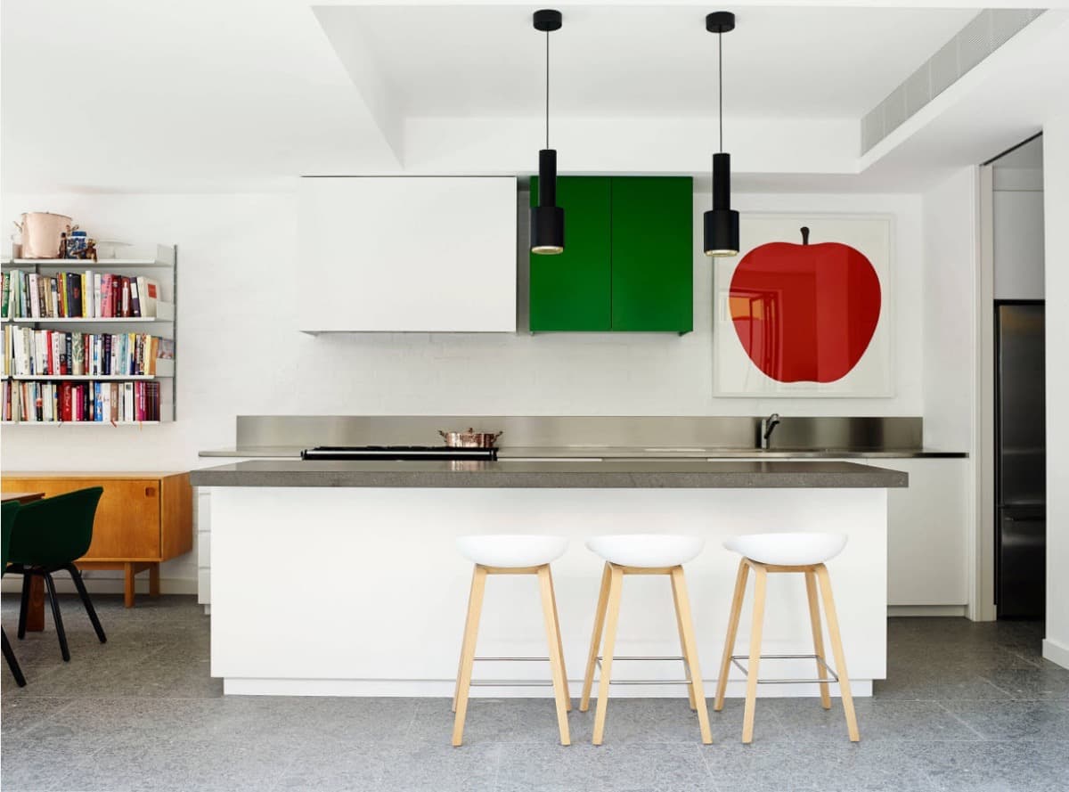 - При выборе контрастных оттенков тон должен сочетаться с каким-либо предметом интерьера или мебелью. Например, столешница в рабочей зоне или стол должны быть такого же цвета.