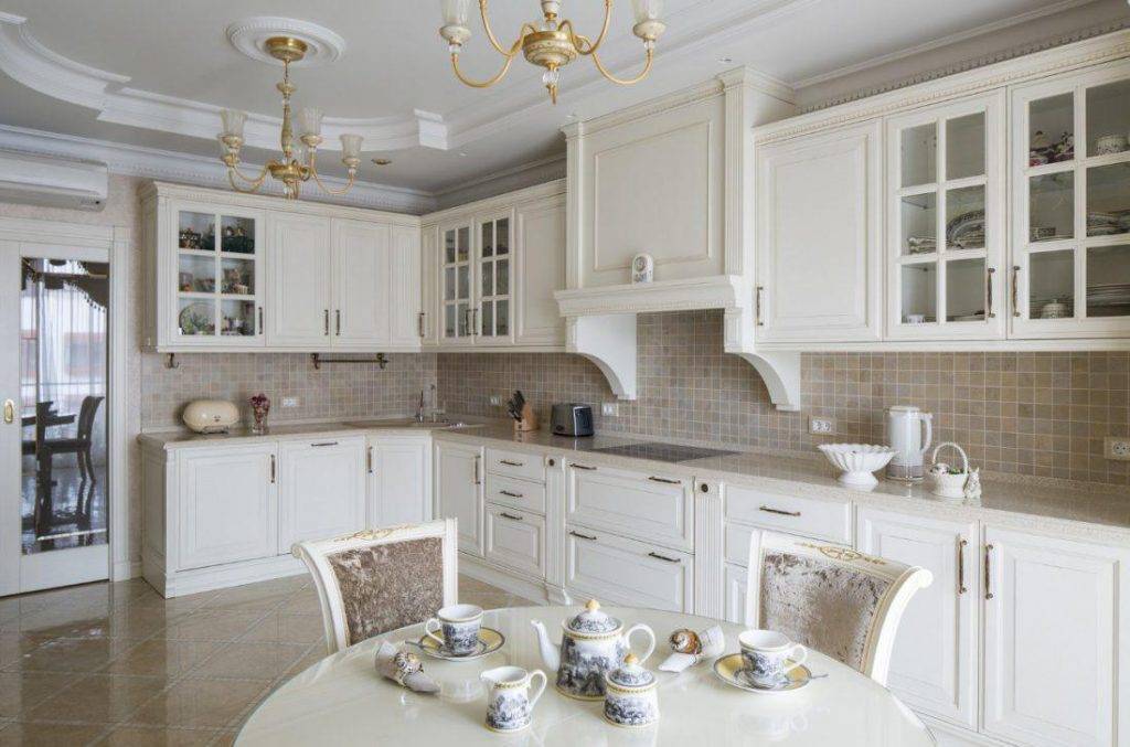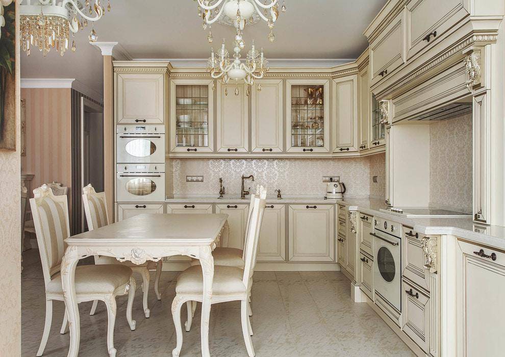 Такая кухня придется по душе практически всем. В данном стиле все сдержано, но не строго. Отлично впишется кухонный гарнитур из массива в светлом цвете с классической фурнитурой. Для освещения можно подобрать «хрустальную» люстру. Обеденная группа должна быть выполнена из тех же материалов, что и кухонных гарнитур. В качестве декора можно использовать вазу с цветами, фарфоровую посуду в серванте или шторы из легких материалов.