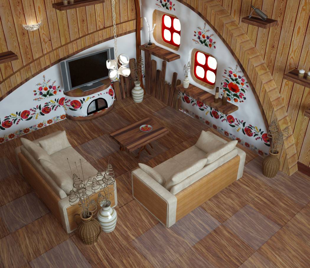На полу лучше всего постелить ламинат, линолеум с рисунком под старинное дерево или керамическую плитку коричневого цвета. Стены также должны быть сделаны «под старину» (см. фото). Организовать это можно с помощью декоративной штукатурки. Что касается оттенков, то лучше всего подойдут оттенки желтого, бежевый, белый, коричневый и синий цвета. Также стены можно украсить росписью, изображая калину, подсолнухи, птиц. В стенах можно организовать ниши, в которых разместить различные декоративные элементы.