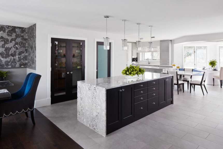 Очень просторная кухня-студия в строгой цветовой гамме несмотря на скупость красок выглядит очень комфортно