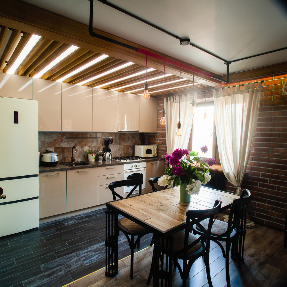 А это кухня 5,5 кв.м. в хрущевке. Как и на примерах выше, холодильник спрятан в нишу, а подоконник стал продолжением кухни.