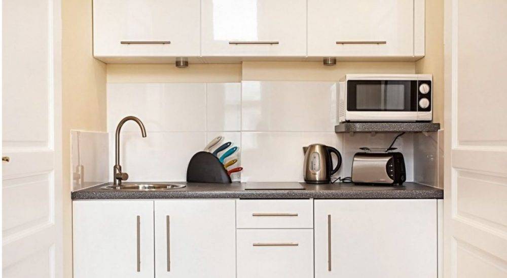 Совет Чтобы исключить недостатки, рекомендуется монтировать кухню-нишу в гардеробе или другом малом помещении. А чтобы спрятать возможный беспорядок на кухне, использовать складные двери – горизонтальные или вертикальные, можно заменить дверями купе.