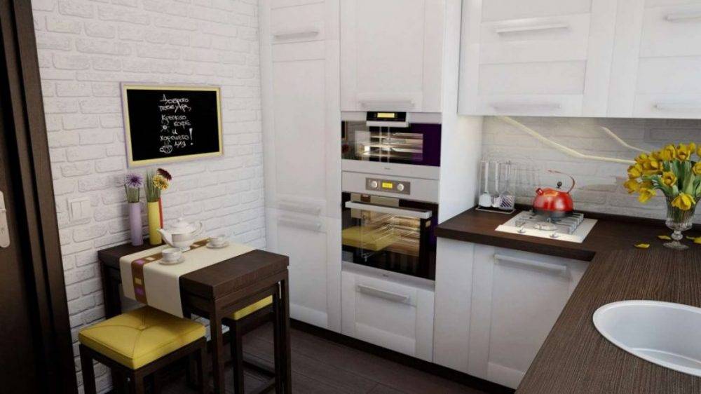 Такой дизайн маленькой кухни 7 кв. м удивительным образом сочетает эргономичность и практичность. Минимализм обстановки разбавляют яркие элементы: текстиль, посудные сервизы, растения. Основной цвет интерьера – белый.