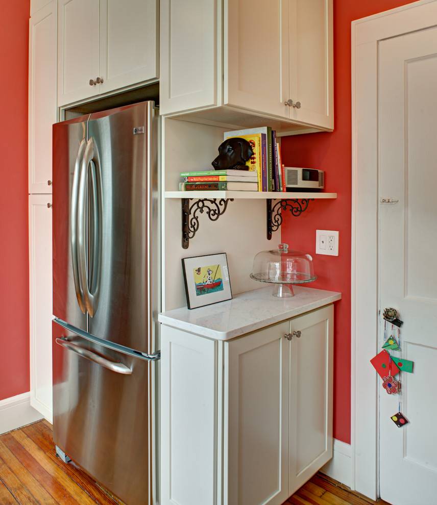 Можно в нише сделать целую комбинацию — там же, где холодильник, поместить духовой шкаф и дополнить пространство шкафчиками и полками.