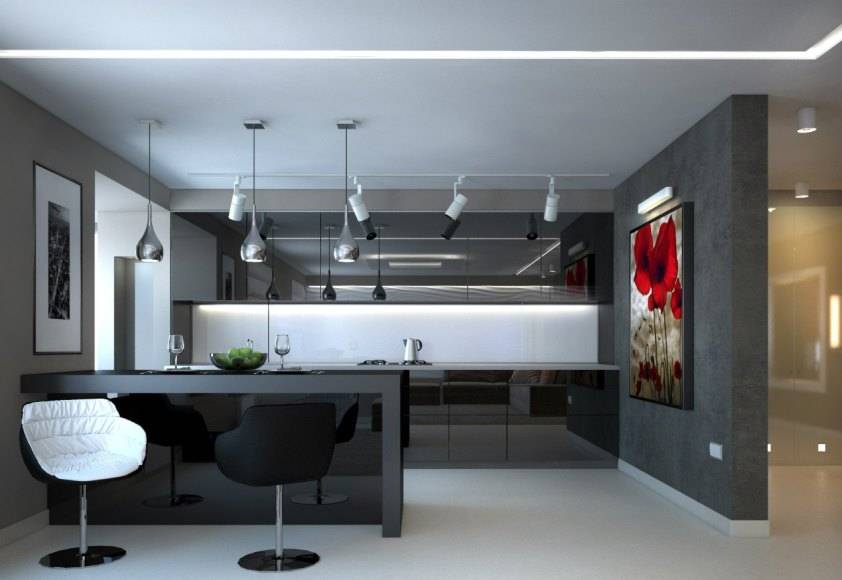 Многофункциональная кухня, оформленная в стиле минимализма в черно-белом варианте Источник roomester.ru