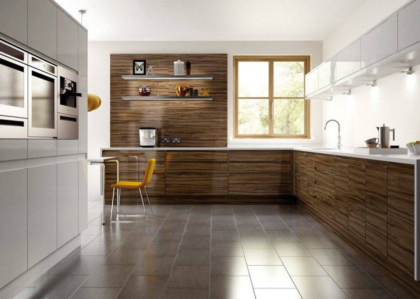 Планировка гарнитура может быть любая – прямая, угловая, островная, еще лучше – без верхних шкафов.
