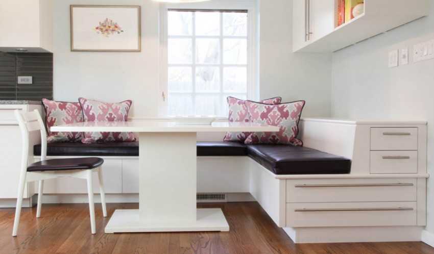 Отлично подходят для маленькой кухни, позволяют рационально использовать каждый сантиметр. Устанавливается такой диван в любой свободный угол, там же организовывается обеденная зона.