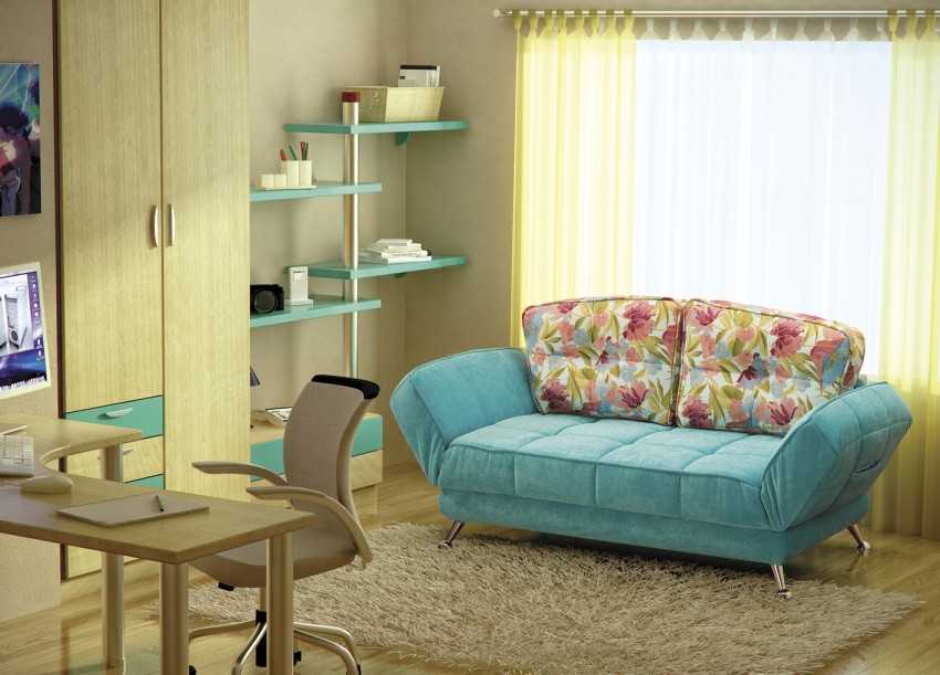 Малогабаритная мебель подбирается для маленького помещения. Диван позволяет спать ночью и комфортно принимать пищу днем. Конструкция предусматривает пустое место под диваном, поэтому ничего не будет мешать ногам. В таких диванах нет ниш для хранения – следует учитывать это при выборе.