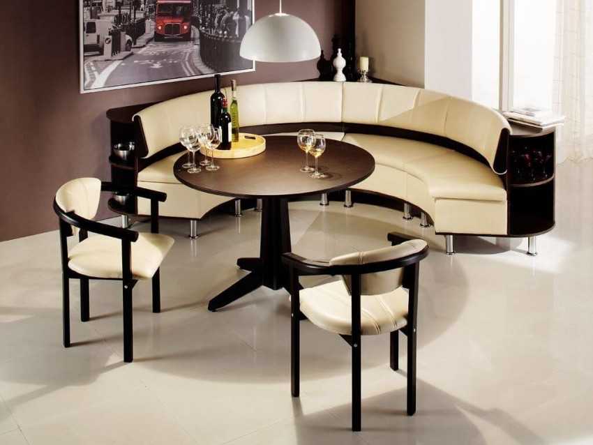 Для небольшой кухни квадратной формы подойдет круглый диван, который займет центральное место у одной из стен. Все формы дивана плавно закруглены. В основном такие конструкции не раскладные. Под сиденьем находится один общий ящик для вещей. В качестве обивки используется эко – кожа или шенилл. Такой текстиль можно вычистить в домашних условиях. Различия круглых и полукруглых диванов невелики. Полукруглые конструкции внешне более вытянуты, напоминают форму овала.