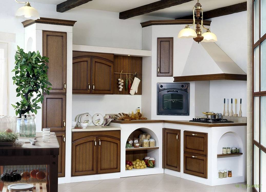 Маленькие угловые кухни, выполненные в деревенском стиле, – это отражение спокойствия и уюта, а также романтики и размеренного образа жизни. Этот дизайн характеризуется следующим: