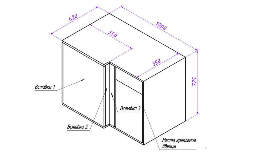 Вертикальная стойка (бок), прилегающая к соседнему корпусу должна быть глубиной 550 мм, то есть больше рядом стоящего шкафчика на 50 мм. Это сделано исключительно ради эстетического внешнего вида кухни, чтобы при входе взгляд не наталкивался на щель между шкафчиками и стеной.