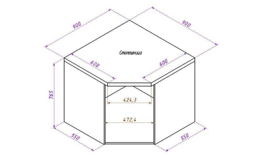 Благодаря этому чертежу становится предельно ясно как именно выглядят дно и крыша кухонной угловой тумбы.