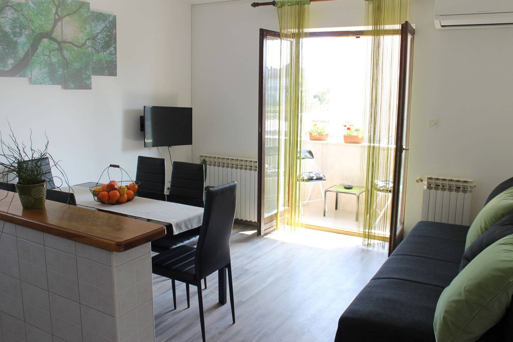 Небольшой диван-раскладушка днем служит местом отдыха или обеденной зоной, а ночью – дополнительным спальным местом.