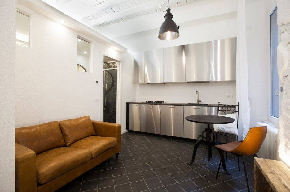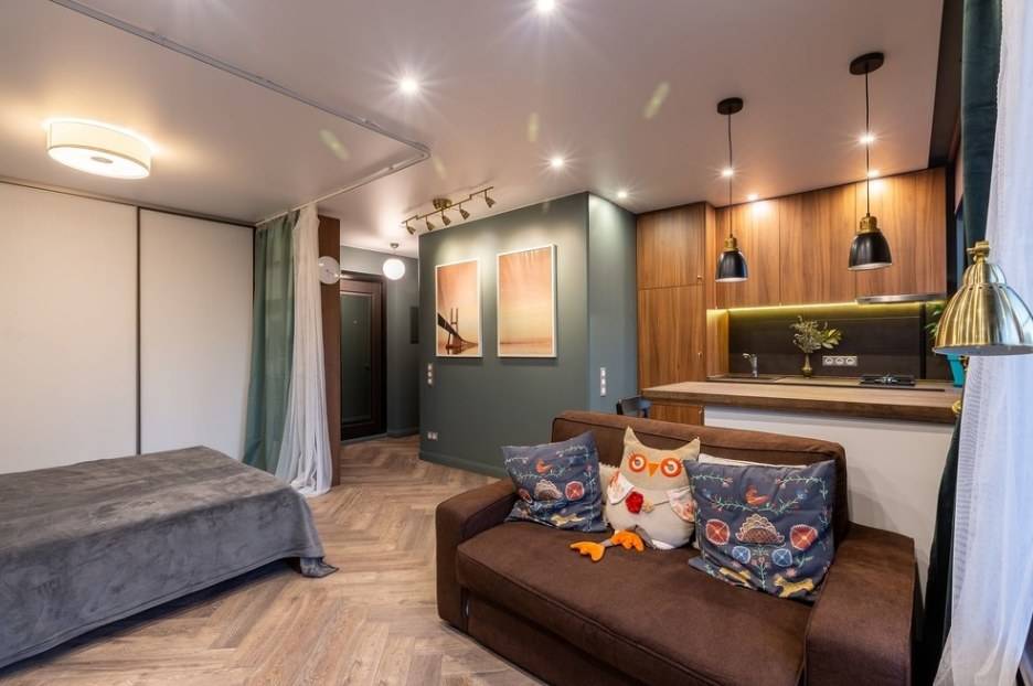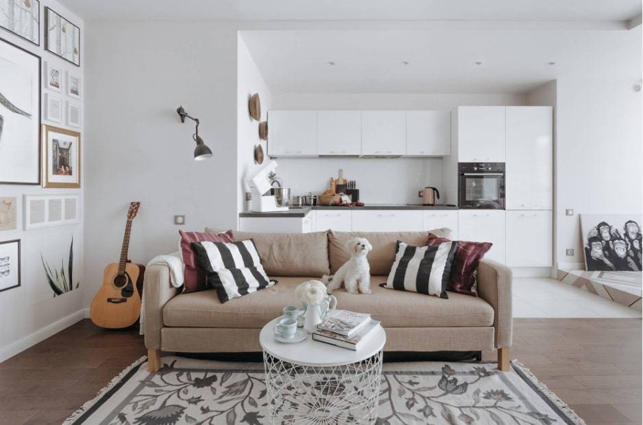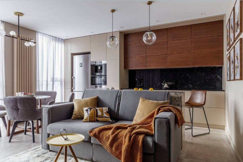 В небольшом пространстве кухни-студии диван может стоять как лицом к кухне, у противоположной стены, так и перпендикулярно к кухонной рабочей зоне.