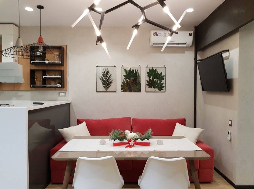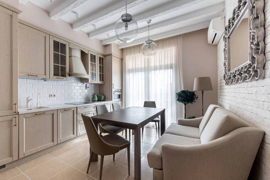 В таких случаях применяется вместительная бытовая техника, компактные шкафы и стойкая штукатурка. А идея употребления пищи на мягком диванчике, наверняка по нраву почти каждому.