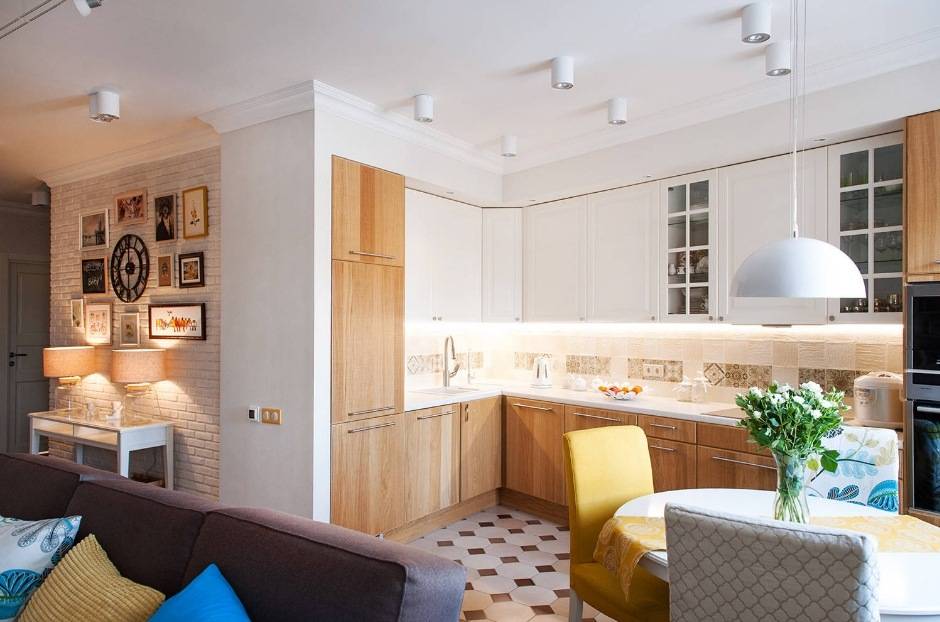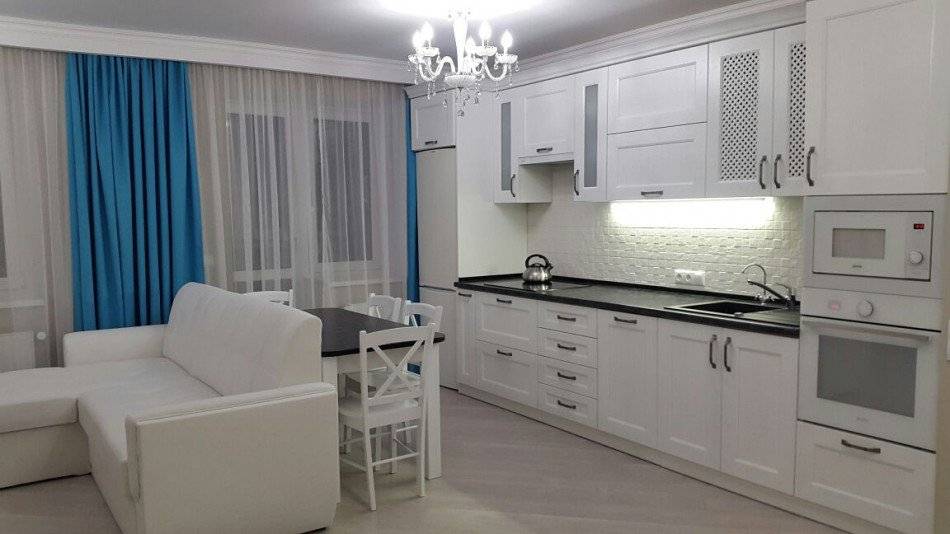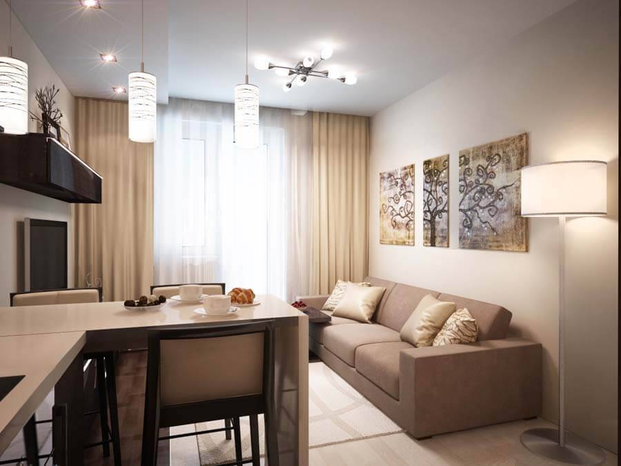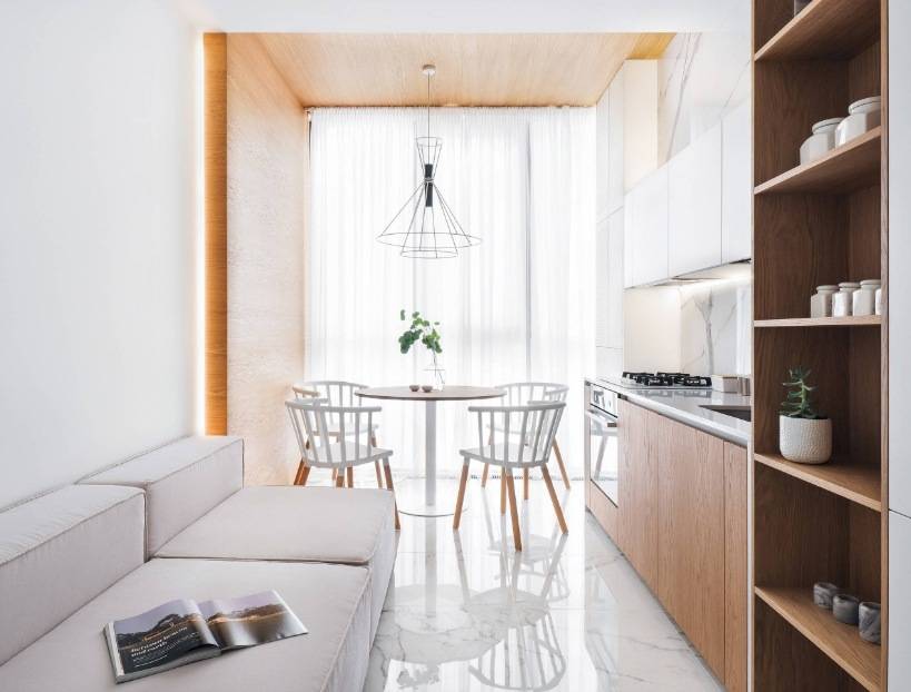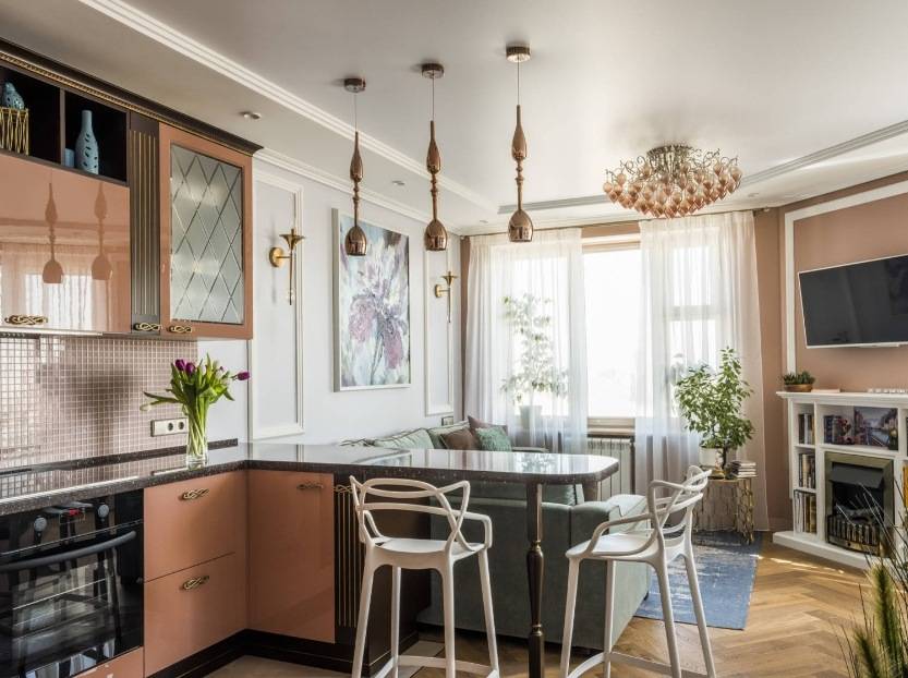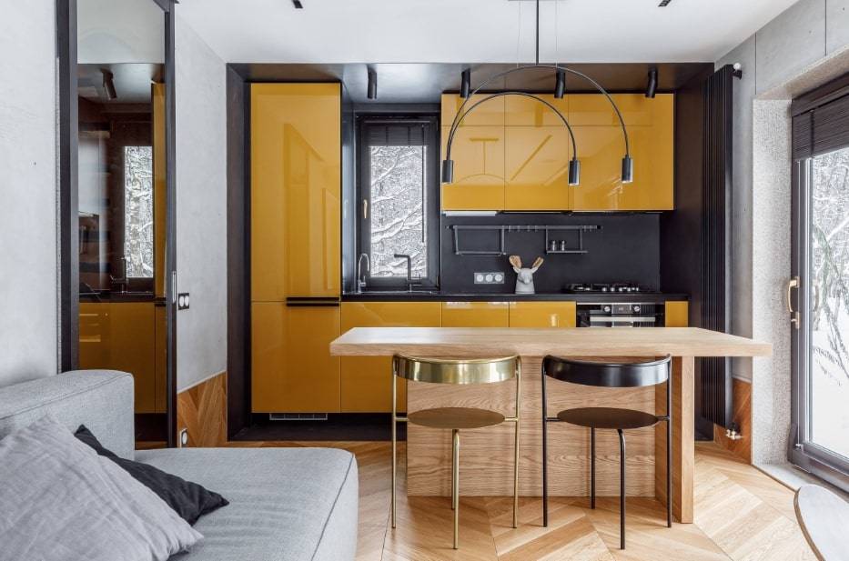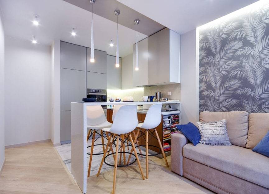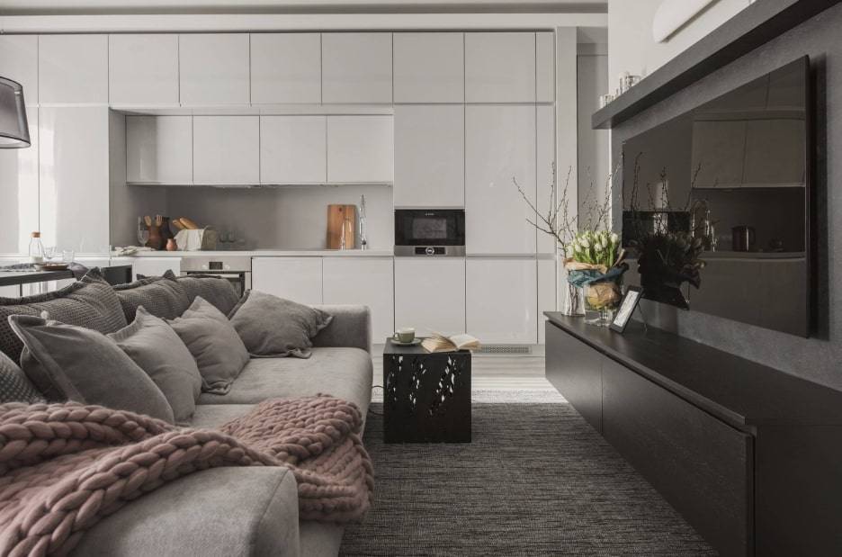 если у вас установлен телевизор напротив дивана, то такая кухня легко может стать ещё одной гостиной, что особенно важно для однокомнатных квартир.