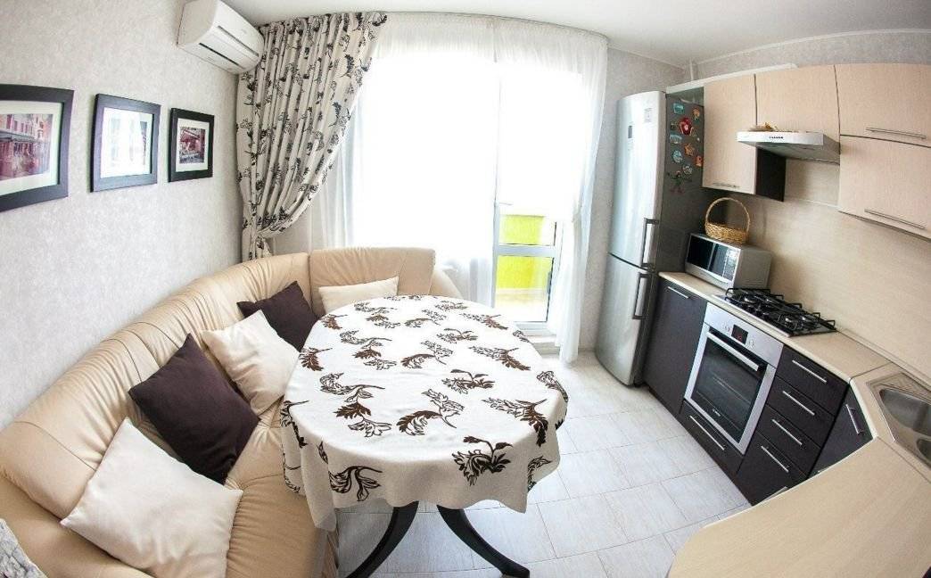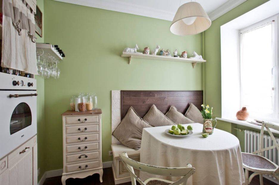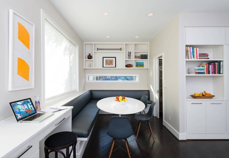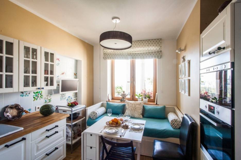 - маленькая квадратная кухня — угловой диванчик, совмещающий зоны работы и отдыха;