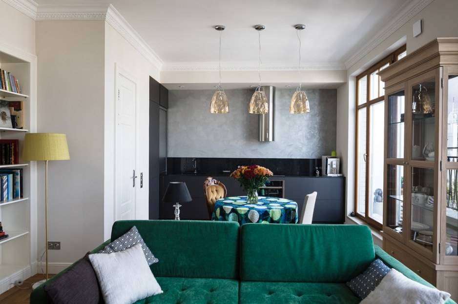 Кухни студии часто оформляются именно с применением дивана и сопутствующих атрибутов. В случаях когда гостиная и прочие комнаты для приема пищи пересекаются с кухней или неотъемлемы от нее, такой атрибут помещения как диван совершенно незаменимы.