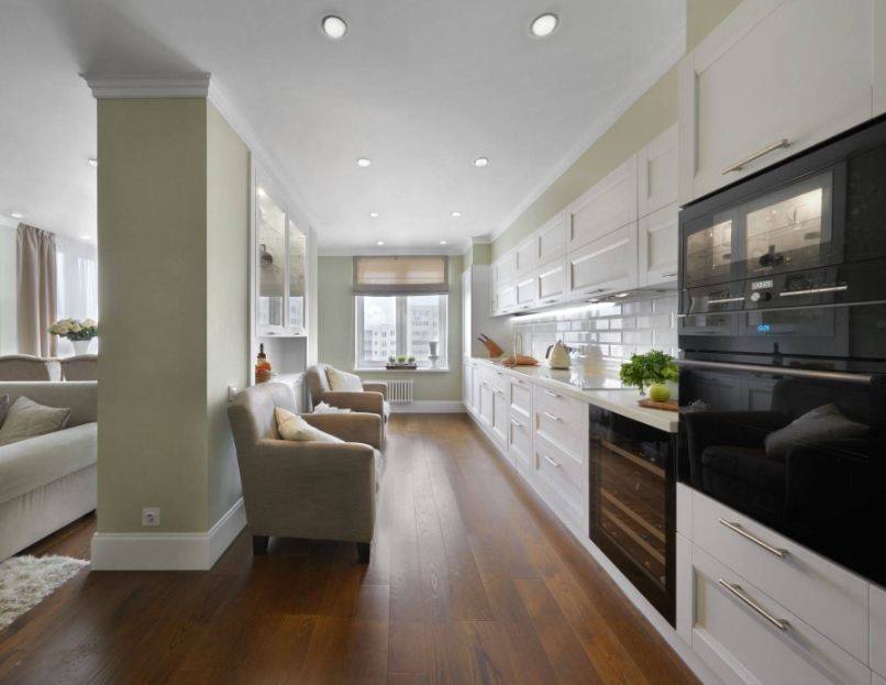 Помогут сэкономить место многофункциональные модели с большим количеством ящиков и полок. Чтобы сделать комнату визуально просторнее, стоит отказаться от обилия предметов и вдохновиться идеями минимализма. Бытовая техника в таких случаях приобретается встроенная.