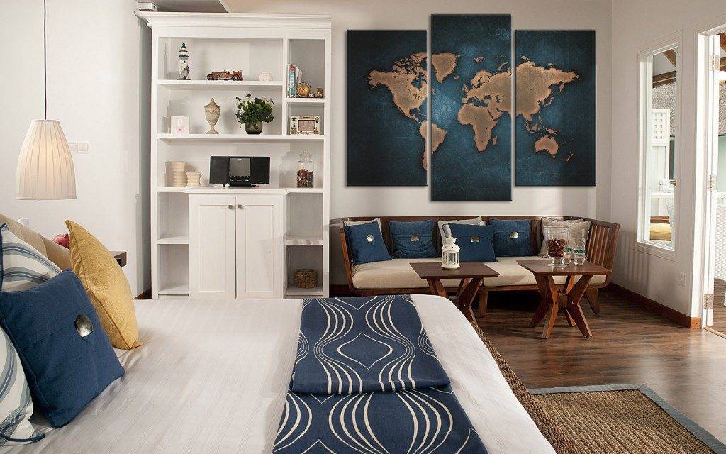 Для придания интерьеру разнообразия можно покрасить в контрастный цвет одну из стен. Как правило, это стена за изголовьем кровати. Также можно оклеить ее обоями с интересным рисунком. Такой прием разнообразит интерьер, не ухудшит визуальное восприятие пространства и поможет избежать ощущения замкнутости. А оно может возникнуть в небольшой комнате с однотонными стенами и ограниченным набором предметов мебели и декора.