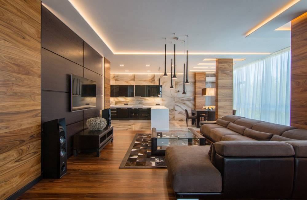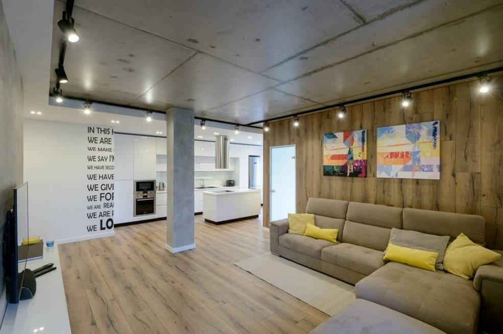 В большой комнате целесообразно использовать ламинат для отделки вместе с другими материалами.