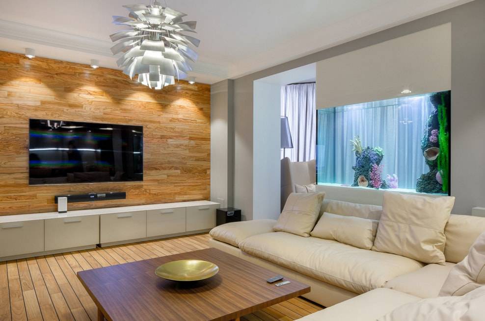 Темную гостиную можно легко «осветлить», облицевав главную стену ламинатом светлых тонов. Также допустимо отделать часть стены или даже угол, если это подчеркнет стилистику интерьера. Теплые оттенки будут идеальны для помещений выходящих окнами на северную сторону. Это не только сделает комнату более светлой, но и придаст ощущение тепла.