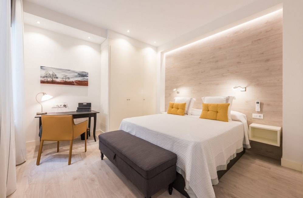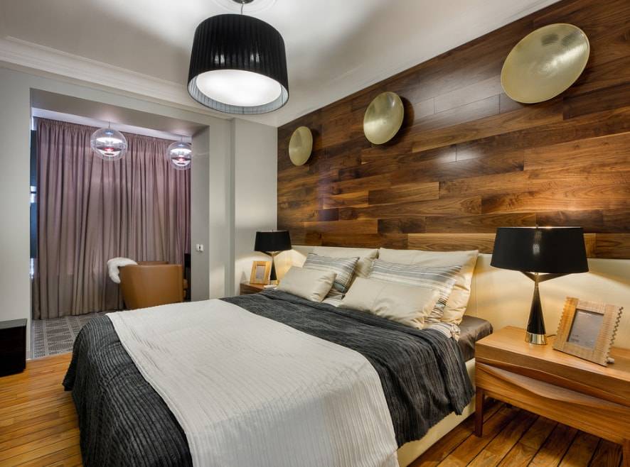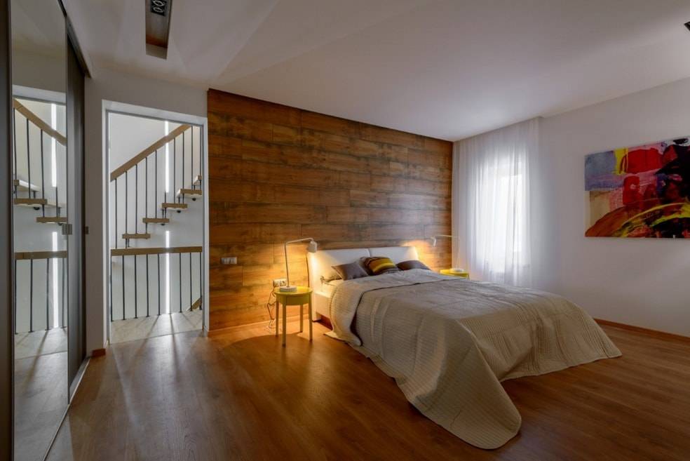 При оформлении спальни лучше придерживаться правила одной стены. Дабы не потерять индивидуальности, в спальне декорируют ламинатом только стену, прилегающую к изголовью кровати. Оттенок и фактуру лучше подобрать в одном ключе с постелью, так не возникнет дисгармонии. Полочки и декоративные детали в тон повысят функциональность помещения. Также на этой стене возможно расположить светильники и картины. Если оформить ламинатом не всю прикроватную зону, а лишь вертикальную часть у изголовья и продлить декор со стены на потолок, можно создать эффект балдахина.