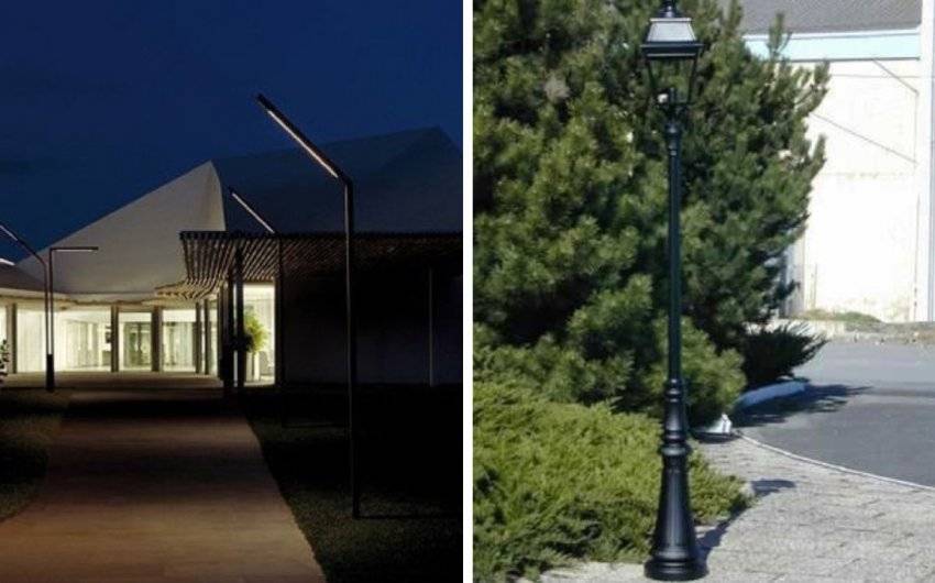Существует большое множество самых разнообразных моделей, имеющих современный дизайн, стилизованных под старину, оснащенных стеклянными плафонами или коваными элементами. Выбор формы светильника осуществляется в зависимости от общей стилистической концепции. Именно они и подчеркивают направление темы и задают тон для подбора другого декора ландшафтного дизайна.