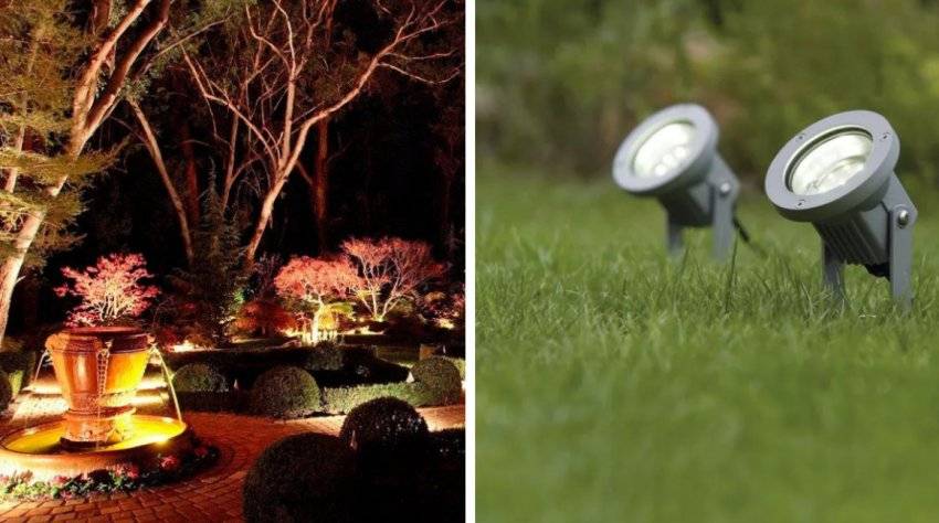 - точечное освещение — используется для подсветки отдельно стоящих деревьев и кустарников, а источник света обычно располагается снизу или сбоку от объекта.