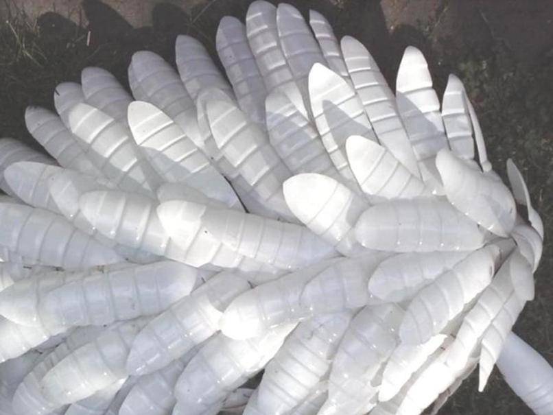 - Для изготовления головы птицы возьмем белую бутылку с узким горлышком. Отрезаем нижнюю часть и прорезаем вдоль с шагом 5мм, как изображено ниже.