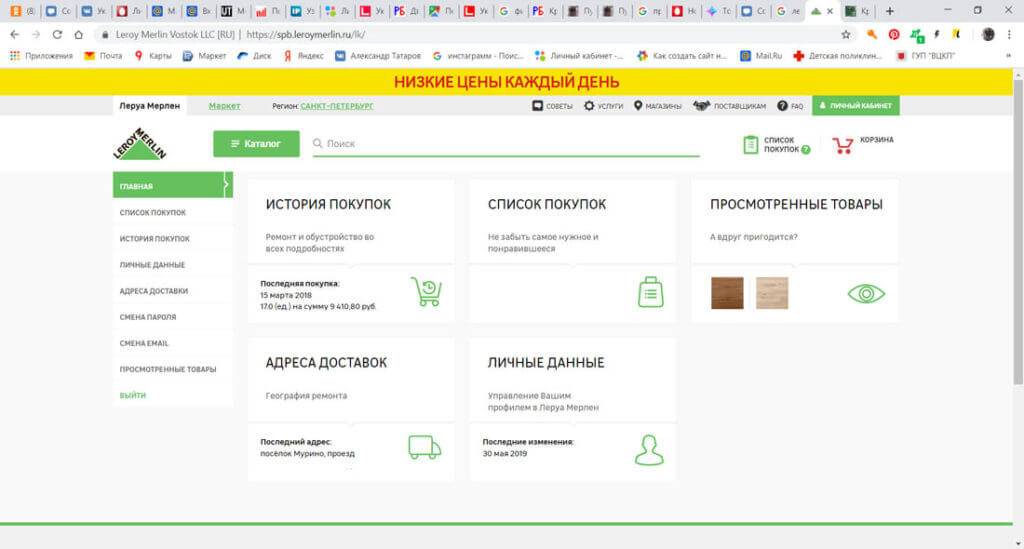 Став счастливым обладателем сервисной карты Леруа Мерлен 28 мая 2019 года, отправился домой. Зашел из ноутбука в личный кабинет посмотреть произошла ли активация (регистрация) сервисной карты. Никакой информации о пластике не нашел. Обнаружил историю покупок, посмотрел с ностальгией, что и когда приобретал.