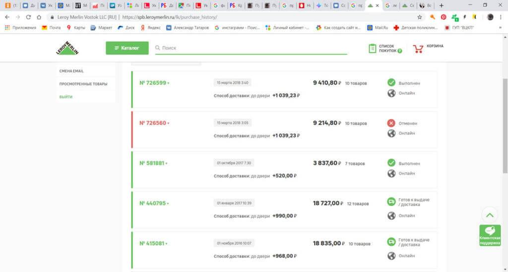 История покупок в магазине Леруа Мерлен без сервисной карты
