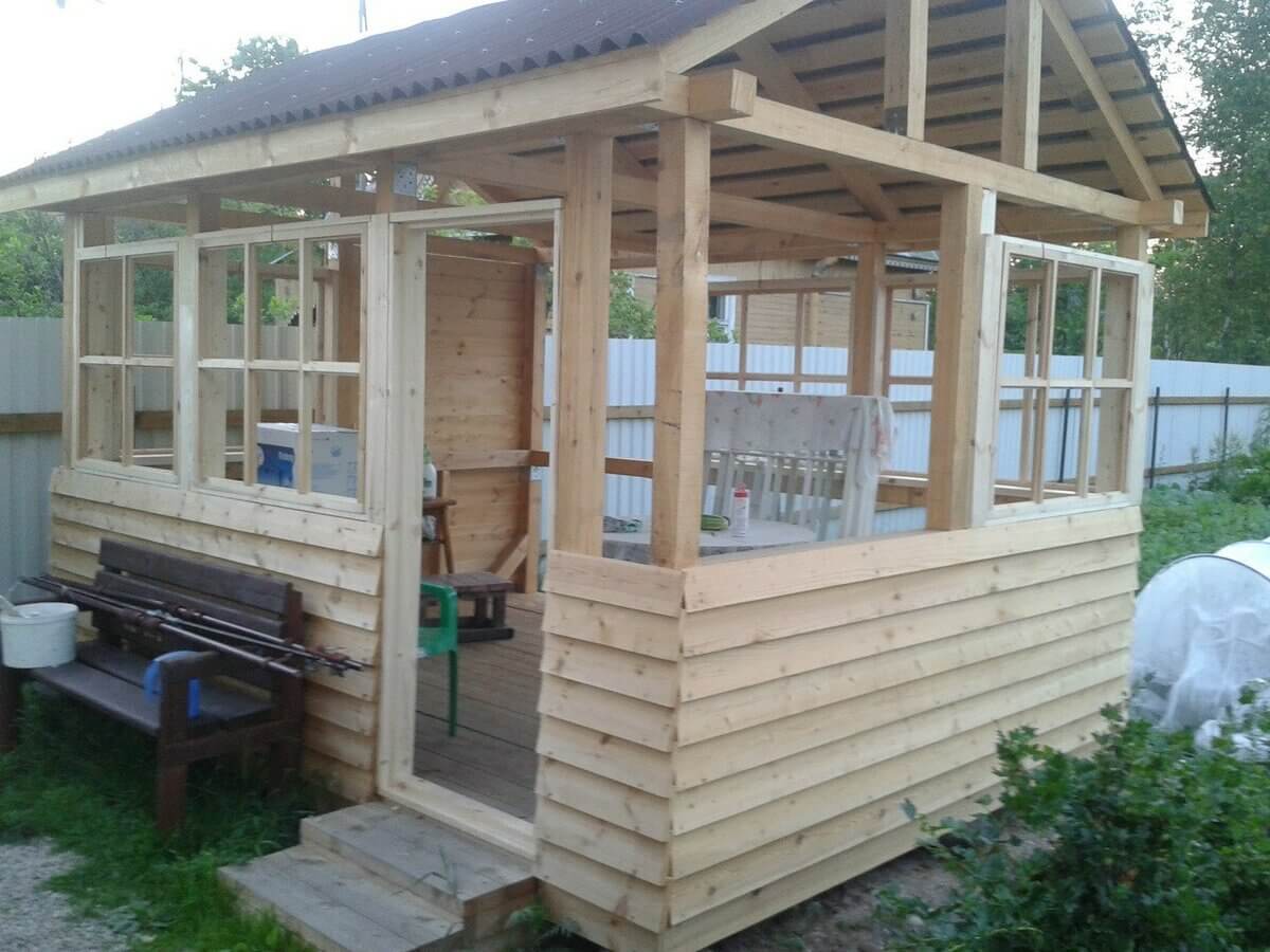Строение из дерева намного проще — материал подбирается самый разнообразный, также можно обойтись без фундамента, обустраивая сооружение в виде времянки. Плюсом деревянного здания являются самые разные варианты его конструкции и возможность легко изменять части уже готовой беседки. Также стоит отметить и экологичность применяемых материалов.