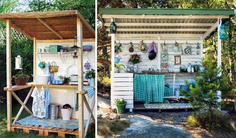 Вы можете сделать кухню под крышей, что облегчает ее обслуживание, защищая снаружи. Рядом с такой кухней можно обустроить пространство для приема пищи (например, под крышей деревянной или алюминиевой беседки, или навесом из вьющихся растений, охраняющих от дождя или яркого солнца).