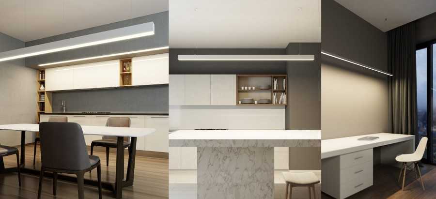 - Возможность создания бестеневого освещения. В отличие от точечных приборов и даже люстр, создающих световое пятно, линейные светильники позволяют качественно и равномерно осветить все помещение.