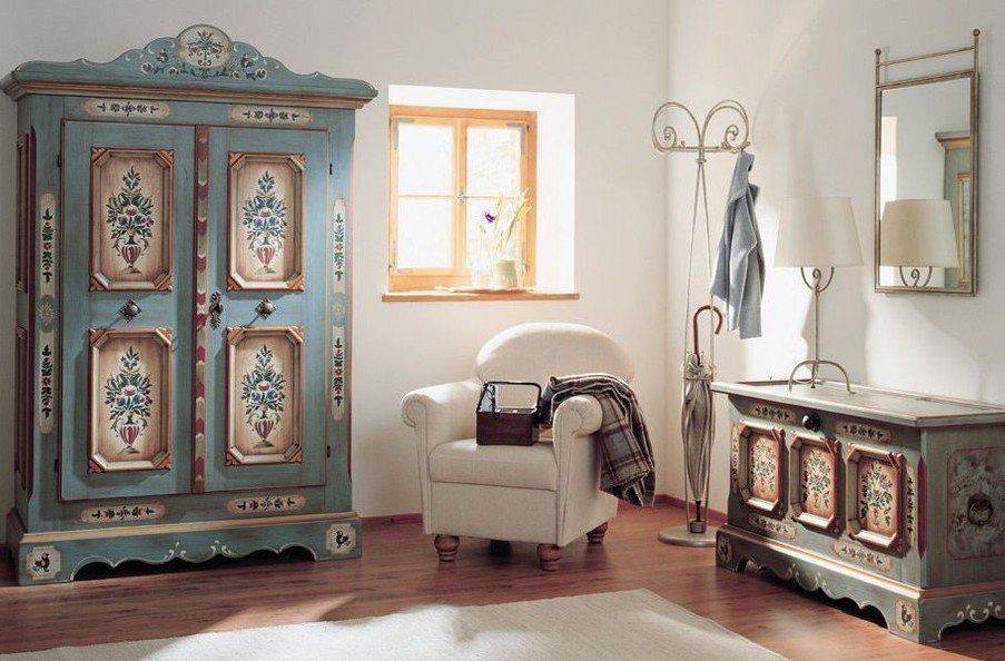 В декорировании домов в стиле рустик преобладают цветочные орнаменты. Мебель в помещении искусственно состаривают. В интерьере уместно использовать деревянные лавки и большие столы. Для декора жилья часто используются натуральные ткани с яркими узорами, вышивкой или кружевами.