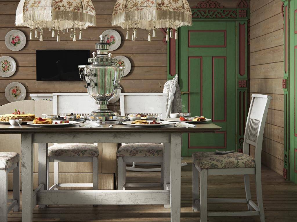 Деревенский русский стиль в интерьере загородного дома можно подчеркнуть с помощью декора. Однако он должен быть достаточно сдержанным. Достаточно использовать пару предметов народных промыслов. Опять же украшением гостиной, выполняющей функции столовой, станет большой самовар, расписанный под Хохлому. Подойдут и «сочные» натюрморты и картины с сюжетами, характерными, например, для творчества Кустодиева.