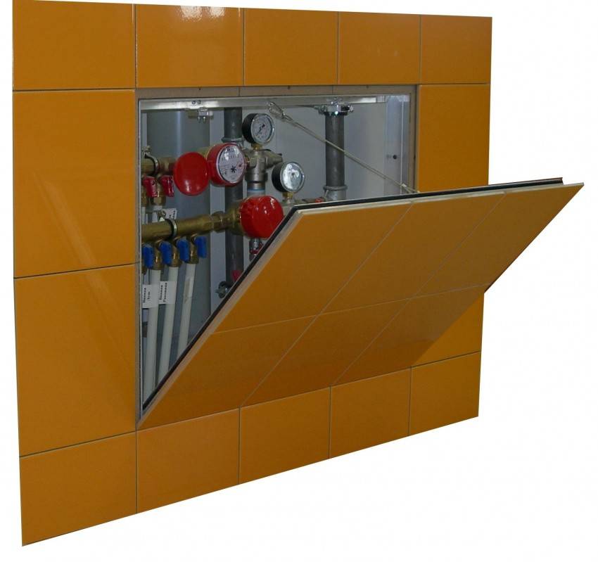 Иногда делают технические ниши больших размеров, например, если необходимо замаскировать за фальшстеной бойлер, распределитель, фильтр, счетчик, коллектор холодной и горячей воды или другое оборудование. Нередко большая ревизионная ниша требуется в туалете или совмещенном санузле для обслуживания канализации. Если найти люк подходящих размеров не удается, то можно прибегнуть к другим способам маскировки коммуникаций.
