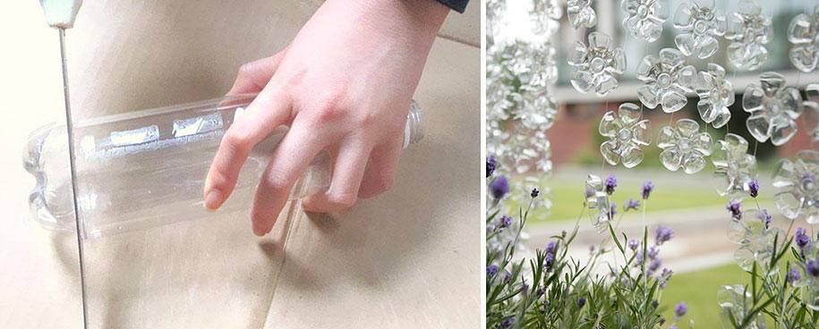 Разрезать бутылки. Вырезать из них цветы, животных или геометрические фигуры. Что из этого выбрать, зависит от вашего желания.