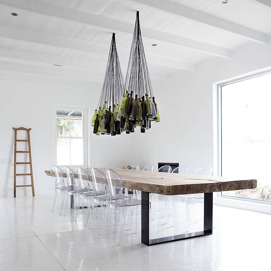 - Любителям эксцентричных стилей придется по душе вариант люстры из винных бутылок. Такой люстры точно ни у кого не будет, экспериментируя с идеей, можно получить изумительный вариант светильника на кухню;