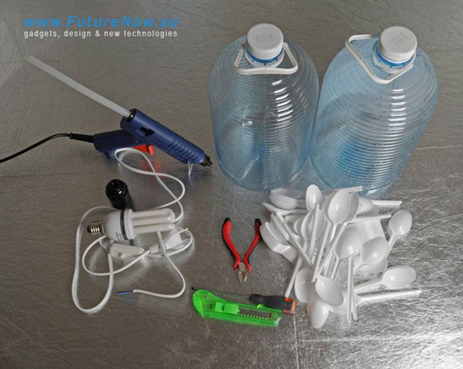 Пластиковая бутылка и одноразовая посуда тоже может перевоплотиться в чудесную люстру. Главное, проявить немного фантазии. Но за нас дизайнеры уже сделали многое, поэтому привожу вариант мастер класса изготовления из пластика.