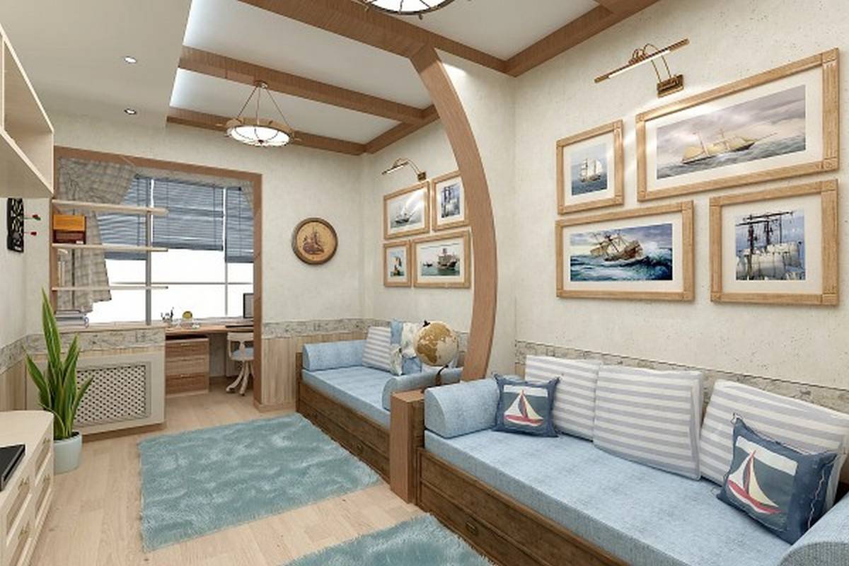 Вдруг он мечтает стать моряком, значит оформите в виде палубы корабля, где будут канаты для совершенствования ловкости, мостик со штурвалом, спасательный круг с биноклем и даже смотровая вышка. Такая комната точно будет ему в радость.