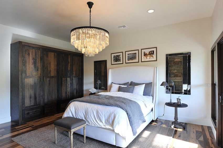 Люстра в интерьере спальни является декоративным элементом. Современные помещения часто выглядят просто и лаконично, поэтому в них присутствует минимум украшений. Люстра становится важным атрибутом в таком пространстве.